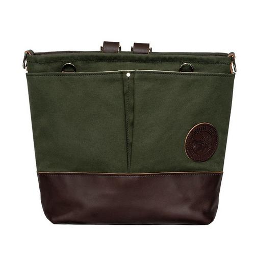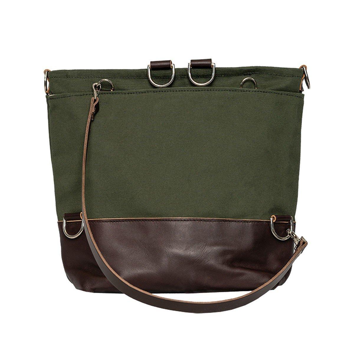 Introducing the Convertible Jet-Setter Tote by Duluth Pack. This Made in the USA multi-functional tote bag is handcrafted of rugged 15-ounce canvas construction and made of premium American leather bottom detailing. Accompanied with the iconic round leather Duluth Pack logo and built with two premium leather straps, that can be worn over 5 different ways depending on personal preference. Wear as a shoulder tote bag, crossbody purse, standard backpack, or crossover pack, the Convertible Jet-Setter Tote Bag is one you will buy once and have for life. Four open side pockets can be used to hold diapers, water bottles, office equipment, or small personal belongings. A clasped leather strap lays over the zip closed Jet-Setter body to hang from under a restaurant table or on a stroller. The Convertible Jet-Setter Tote is lined with an anorak material for easy clean-up and contrast colorway to locate personal belongings inside the tote easily. All hardware and sewing seams are weatherproof and guaranteed for life.