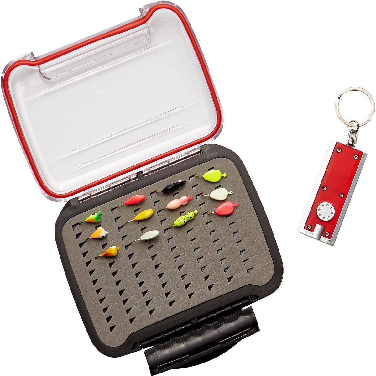 Great starter kit for storing your glow ice jigs. Includes the storage case with 12 glow ice jigs and glow light. Total 14 pieces