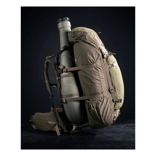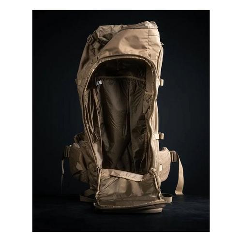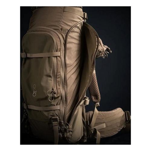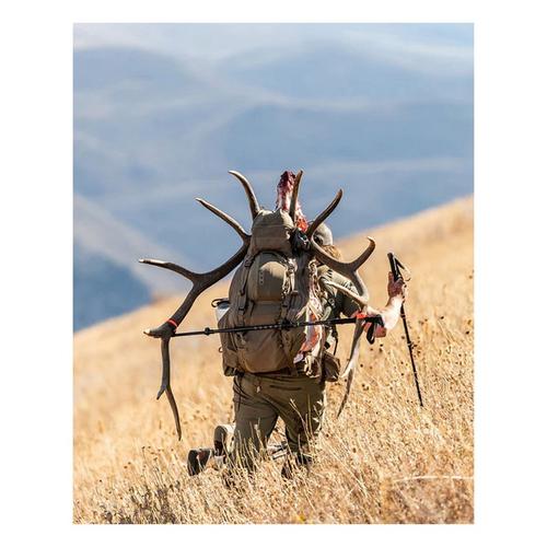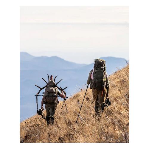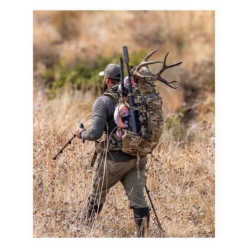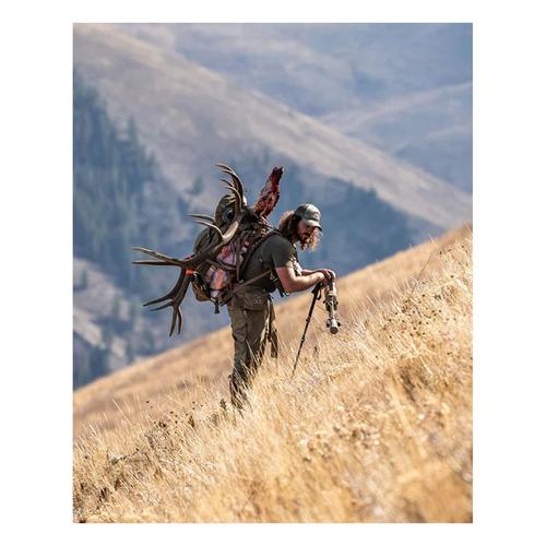 6,500 cubic inches of space provides sufficient room for all your gear on a 4-5 day hunt. An expandable roll top allows you to add extra camping gear, insulating layers, or anything else you may need in the alpine. The Brute 6500 offers dual access to the main compartment—either through the integrated roll-top or a large front zipper panel. On the front, there is a stretch pocket built for storing quick-access essentials like rain shells and wet-weather gear. Inside, you’ll find a hydration hanger loop and elastic stuff pockets for smaller items. A full-length stretch pocket on one side of the pack provides storage for a spotting scope or other quick-access items. After dropping camp, tighten the straps down to compress the 6500 into a more streamlined day-hunting pack.