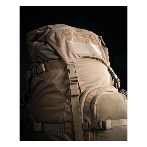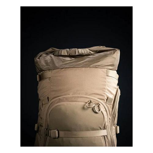 The Brute 6500 features a removable lid that attaches to the frame using gate-keeper clips. On top of the lid, there's a stretch pocket for quick access to larger, irregularly shaped items like water bottles or survival kits. The front includes a general-purpose pocket for small items such as tools, headlamps, snacks, or medical equipment.