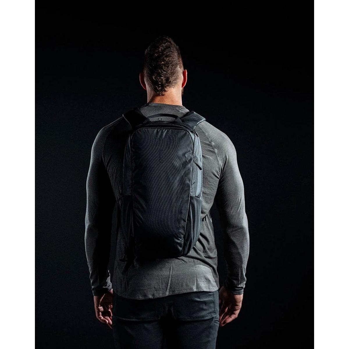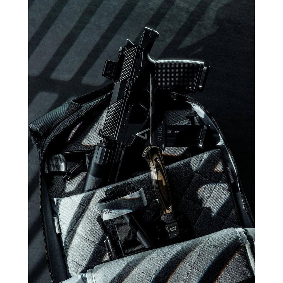 Unzip the back panel to find a compartment that's sized to fit your handgun, or open the main compartment to secure larger firearms in front of the floating tech sleeve. A quick-disconnect retention strap keeps your choice of carry secure and easily accessible when needed. A structured, padded base eliminates printing and allows the pack to stand upright on its own.