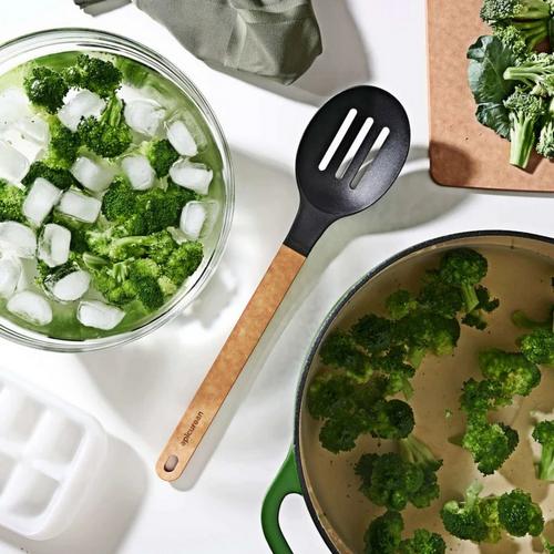Epicurean’s Gourmet Series Utensils feature eight styles of nylon heads paired with our sturdy and comfortable paper composite handles. A handy built-in kickstand keeps messy heads off clean counters. High-temperature nylon heads are heat resistant to 500F/260C and are safe for non-stick pans.