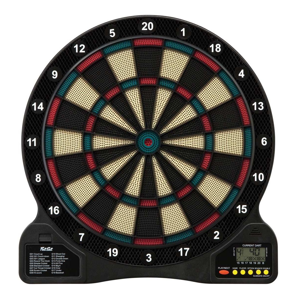 An excellent addition to you rec room or favorite hang-out spot. Features 26 games and an eight-player option.Angled spider and LCD display this basic dartboard offers the most popular games played by the masses. 13" target face with tournament spider. Concave dart holes Automatic shut-off Front mounting for easy hanging Missed darts catch ring Single/double in/out options for 01 games.