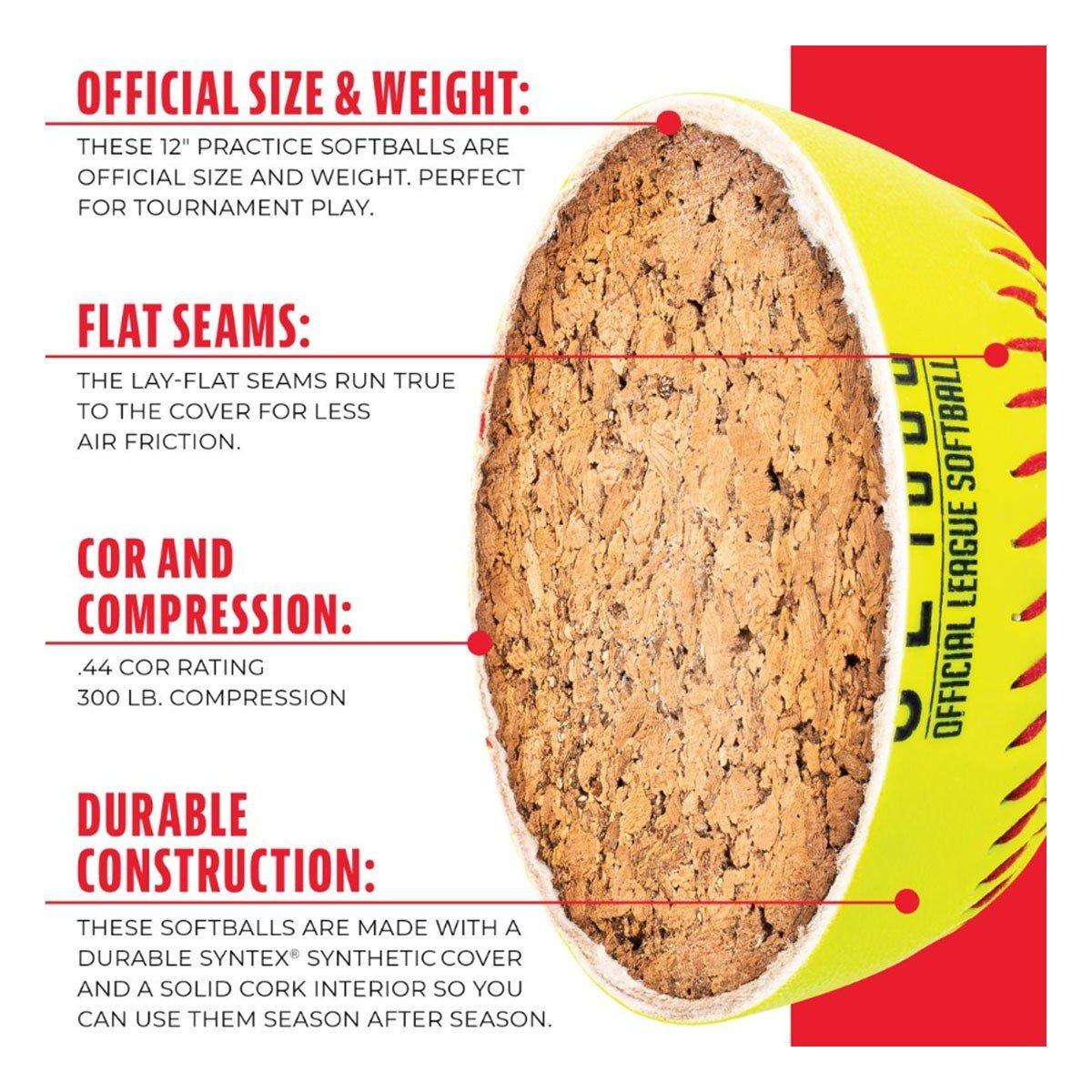 Franklin Sports' OL1000 Practice Fastpitch Softballs are perfect for players of all ages to hit the field and practice fielding, throwing, and pitching! These official size and weight 12" inch fastpitch softballs meet official league specifications for play, so you can practice the right way. Made with a solid cork core and a tough synthetic leather cover, these softballs are built to last season after season. The lay flat seams on these practice softballs also ensure consistent, reliable flight paths and minimize drag to maximize distance on throws. These softballs are the perfect practice and training aids for all fastpitch softball players. This set comes with (12) OL1000 Practice Softballs included, so you have all the balls you need for team practices and training drills. So hit the diamond and start practicing your skills today with the Franklin Sports OL1000 Practice Softballs!