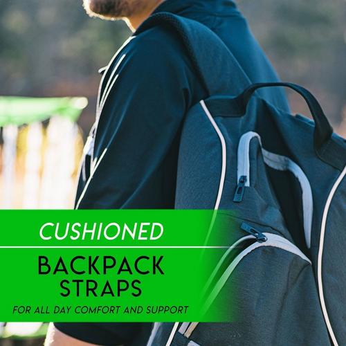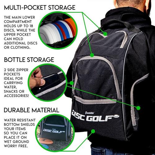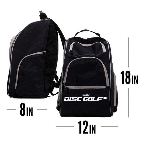 The Franklin Sports Disc Golf Backpack is large enough to provide ample space to hold your disc golf discs, water bottles, accessories or clothing. It can hold up to 18 disc golf discs in the main compartment and a smaller upper compartment that can hold putters, en extra towel or clothing. The bag features (2) water bottle pockets that can also be used to hold accessorizes or snacks. The backpack style allows for easy movement on the course and evenly distributes the weight of many discs as you play.
