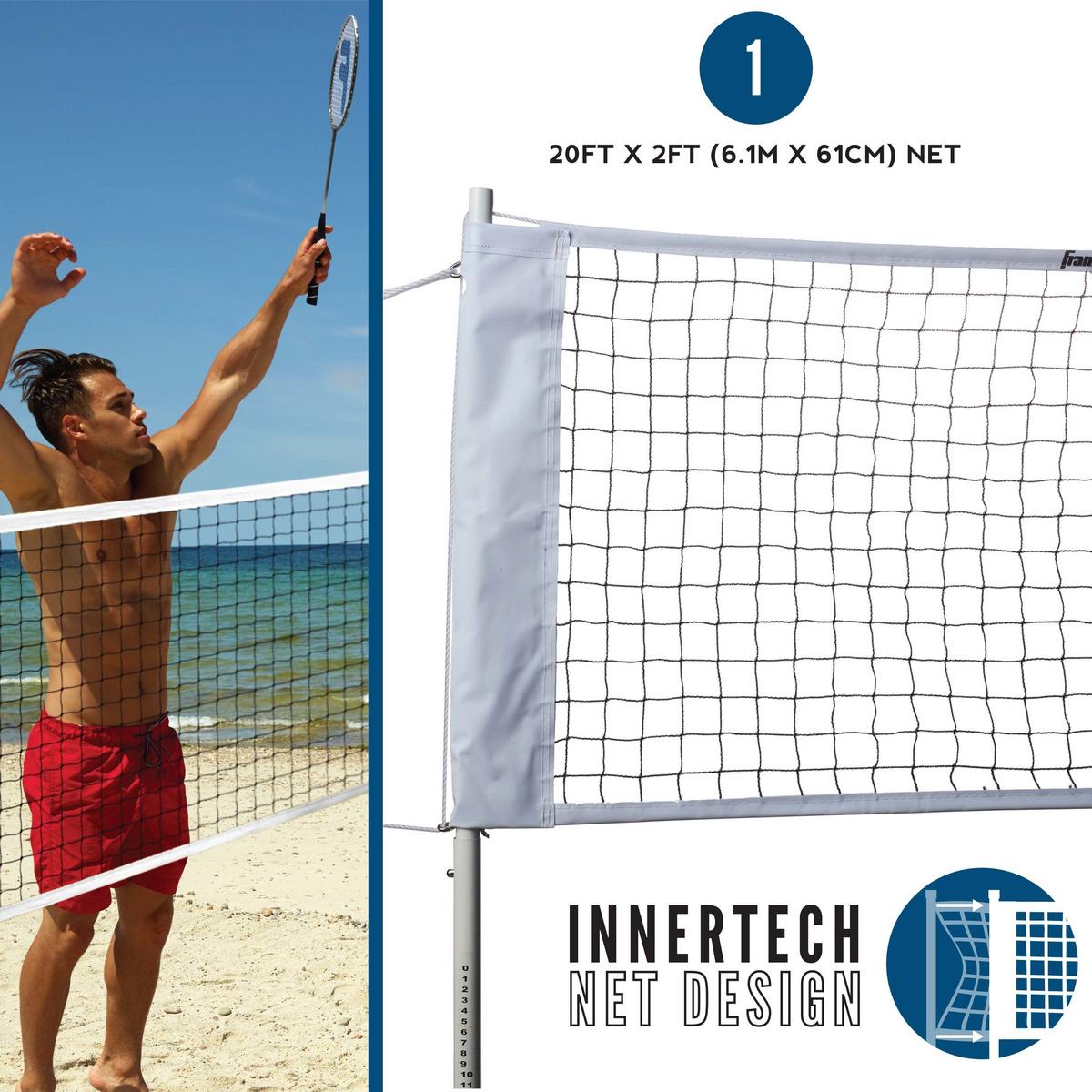 The Franklin Sports Badminton set is a classic outdoor game that will bring hours of fun for all ages. The set includes all you need for a day of fun: (1) Badminton pole set and net, (4) aluminum badminton rackets, (2) nylon birdies and (6) ground stakes/ropes. The Badminton set is easily transportable to your next picnic, BBQ or party and is sure to be a hit. Badminton is a timeless classic yard game...bring this set to your next gathering today!
