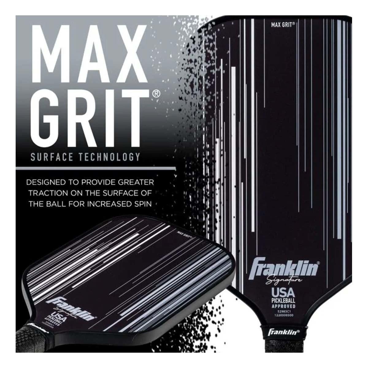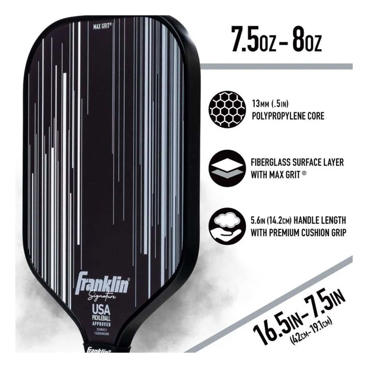 Franklin Sports is raising the bar for Pickleball paddles everywhere with the introduction of our Signature Pickleball Paddle. The premium quality paddle features our brand new MaxGrit™ textured surface technology designed for maximum spin and reduced vibration. The MaxGrit™ surface material is USA Pickleball approved and is designed to provide greater traction on the surface of the ball to increase spin rate for optimal control. Additionally, the polypropylene core and fiberglass surface layer ensure a strong, durable base with an oversized sweet spot for dependable, effortless contact shot after shot. This paddle is the new pinnacle of performance and is USAPA certified for competitive and tournament play. Elevate your game today.