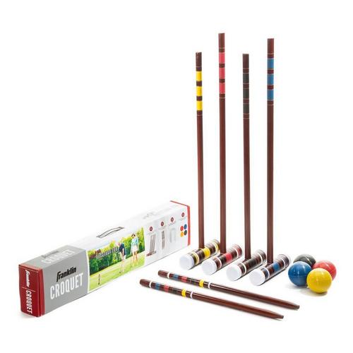 The Franklin Sports croquet set is a classic outdoor game that will bring hours of fun for all ages. The set includes all you need for a day of fun: (4) colored wooden mallets, (4) colored croquet balls, (2) colored wooden stakes, and (9) all-weather wickets. The croquet set is easily transportable to your next picnic, BBQ or party and is sure to be a hit. Croquet is a timeless classic yard game that can be enjoyed by all ages...bring this set to your next gathering today!