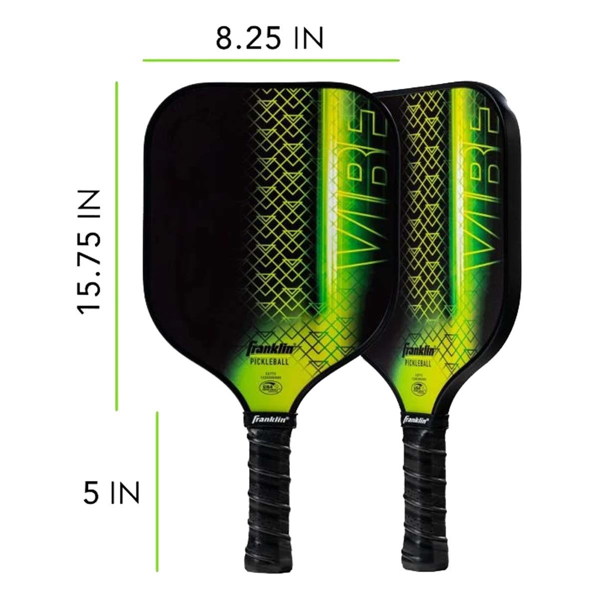 Take your pickleball game to the next level with the USA Pickleball (USAPA) approved Franklin Sports Vibe Pickleball Paddle! This polypropylene core pro pickleball racket is lightweight and designed for high performance. The honeycomb 13mm polypropylene core provides a strong, durable construction that is built to last, while only weighing from 7.7 - 8.2 ounces. This lightweight pickleball racket is also constructed with a non-slip, comfort grip that makes it easy to control on the court. The paddle is coated with our MaxGrit fiberglass surface layer, increasing traction on the pickleball for ultimate spin and finesse shots. Complete with a rugged edge protection band, this pickleball racket is built to perform at the highest level year after year.