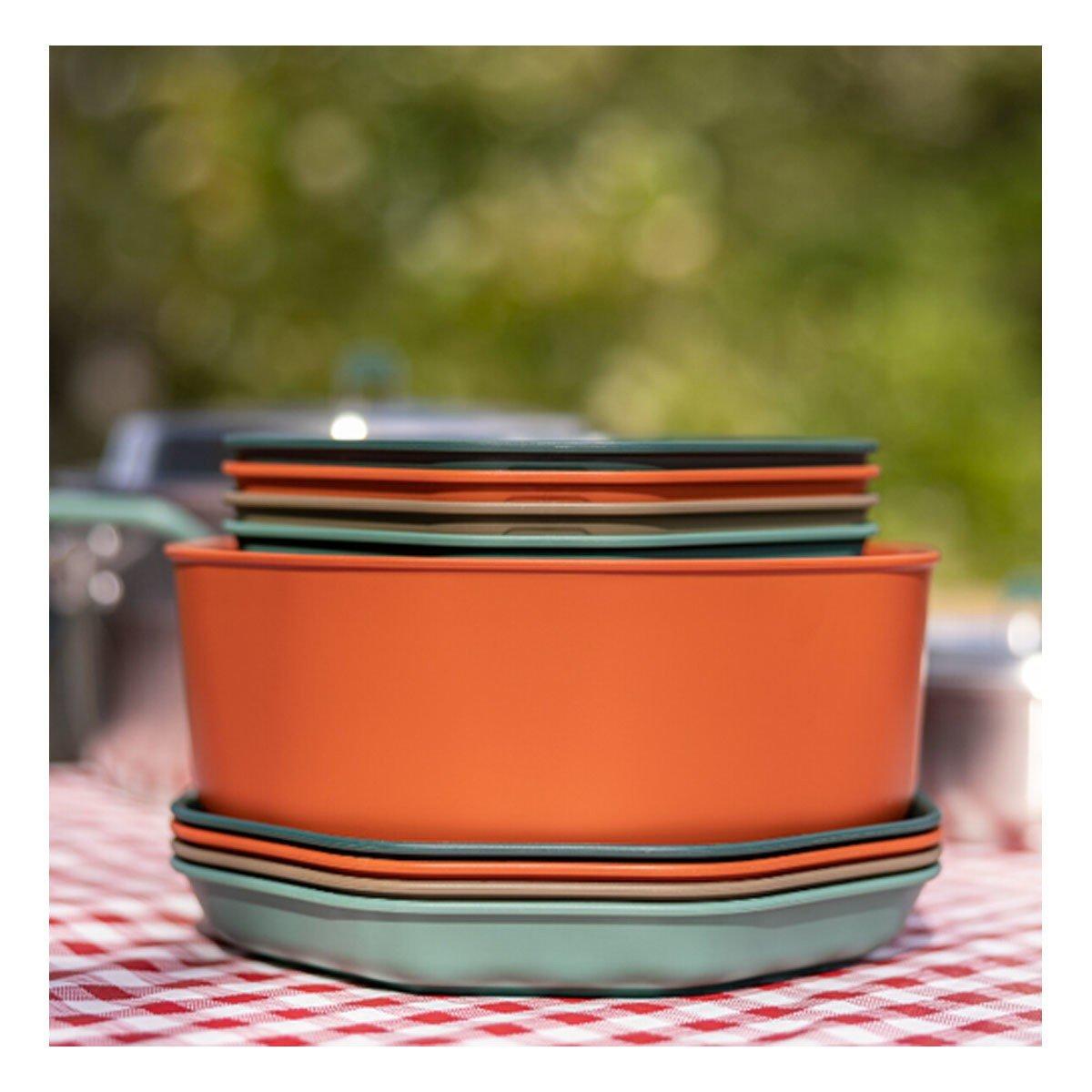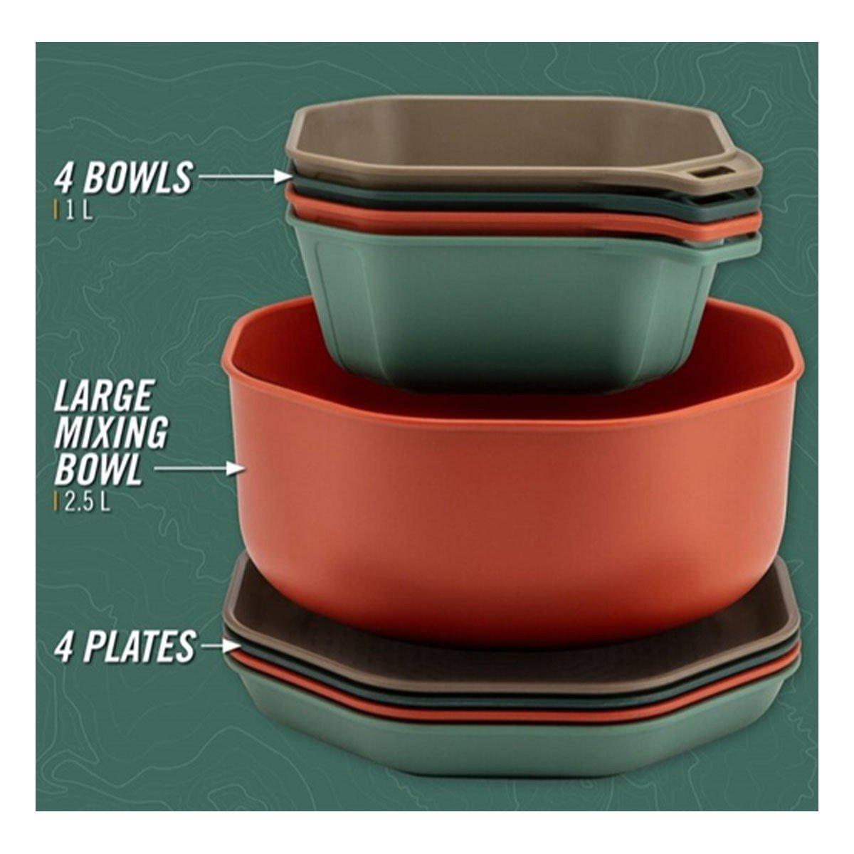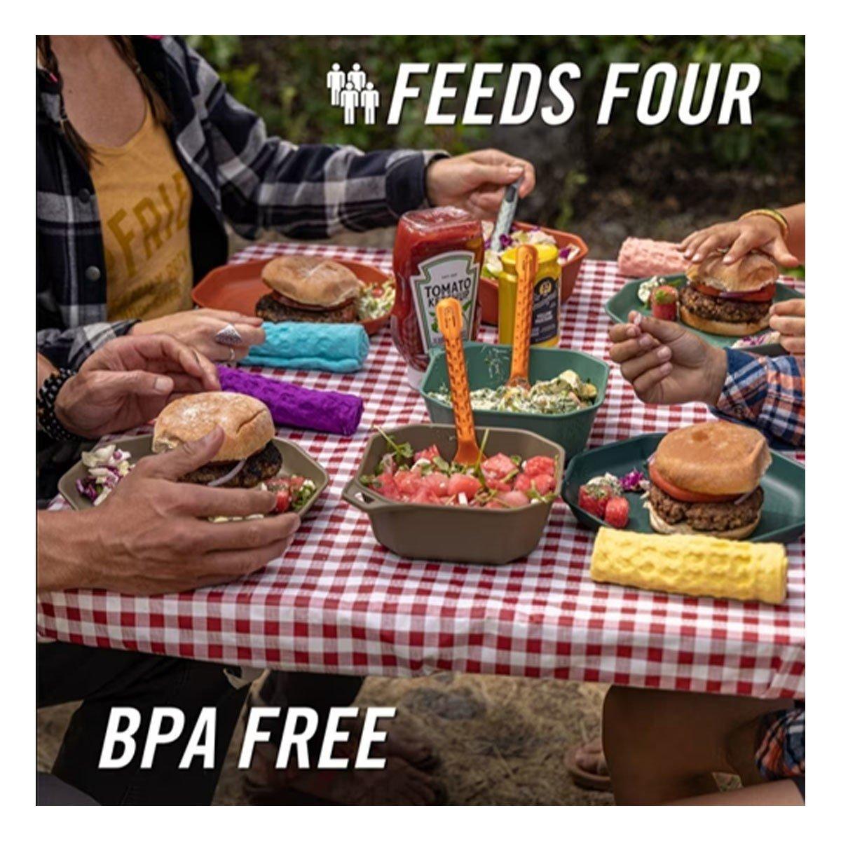 Dine out(side) with the packable 9-piece ComplEAT Tableware Set. Four bowls, four plates, and a 10-cup mixing bowl come together to handle everything from meal preparation to feeding the whole crew. This camping dinnerware set was designed with hungry campers in mind and doesn’t compromise on size, function or durability. When mealtime is over, everything nests together.