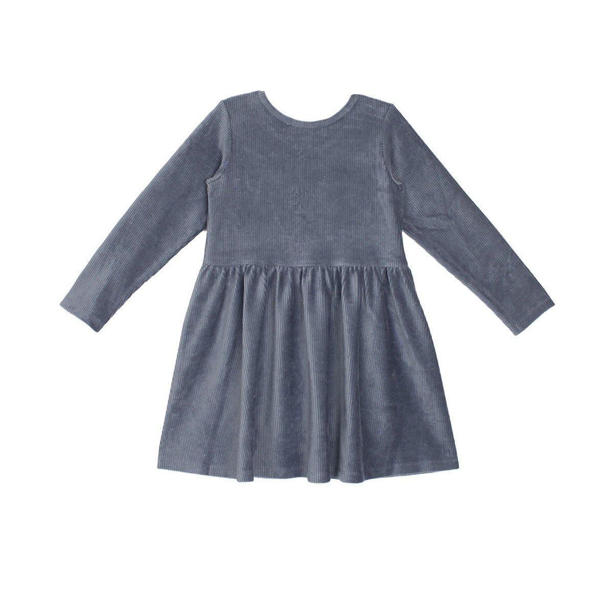 The Skylar Dress is a classic staple crafted in soft denim blue courduroy fabric. This versatile piece features a front wooden buttons, adding a rustic charm. Its gathered waist and long sleeves make it both comfortable and stylish, perfect for school days or casual outings.