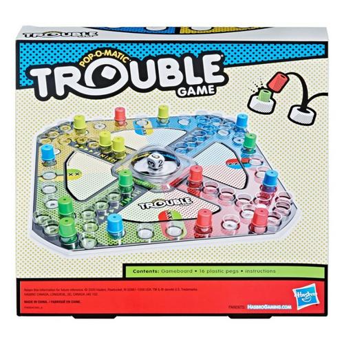Get ready to race to the finish line in this exciting game with the classic Pop-O-Matic bubble that holds and rolls the die. The suspense builds as you try to land on the Double Trouble or Warp spaces that give you additional powers. Can you chase your opponents around the board without getting into trouble and getting sent back to the starting line? The first player to get all four game pieces to the finish zone wins the game.