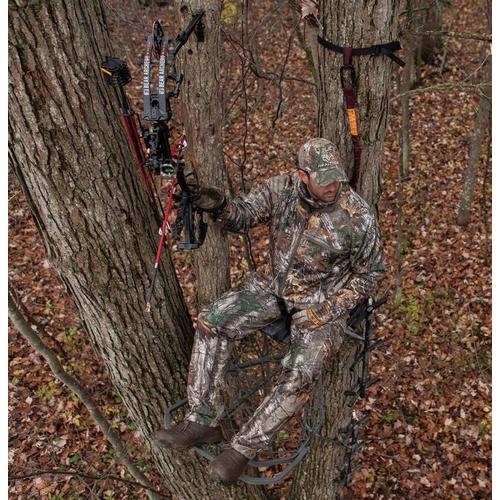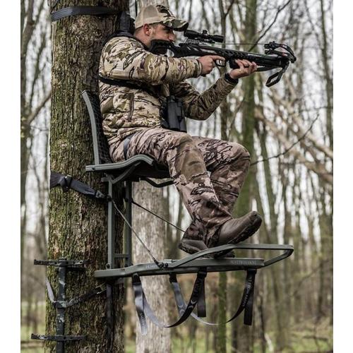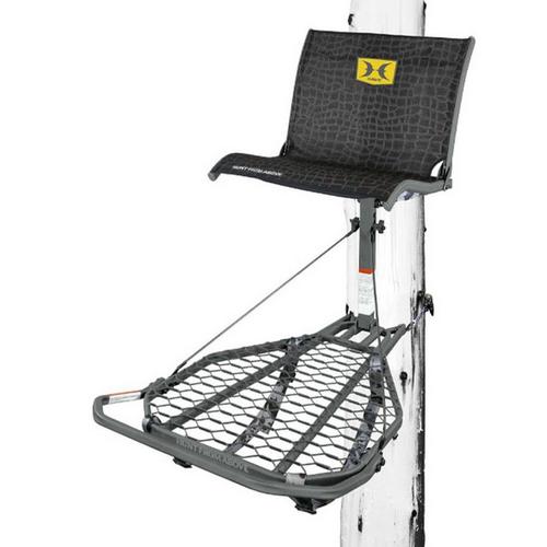 The aluminum version of one of HAWK’s most popular hang-on stands, the HELIUM™ KICKBACK is over 35% Lighter than the original Kickback™. As the name implies, the Kickback series of stands are designed to be the most spacious and comfortable hang-on stands available. Features the Ultimate Kickback Footrest and MeshComfort™ Textiline seat with a contoured backrest. HAWK™ utilizes self-lubricating Dupont® Teflon® bushings/washers and welds every point of the Oversized-Mesh Platform so you can hunt ’Noise-Free’ with confidence. Hunt Stronger. Safer. Smarter. HUNT FROM ABOVE.