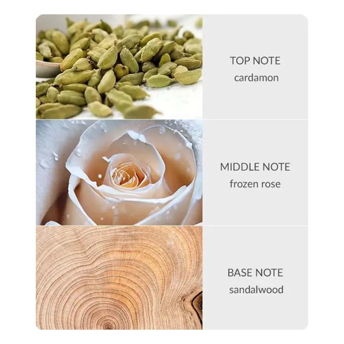 This icy and intoxicating blend of aromatic cardamom, cool sandalwood, and frost-kissed rose evokes woodland walks in nature’s winter tranquillity.