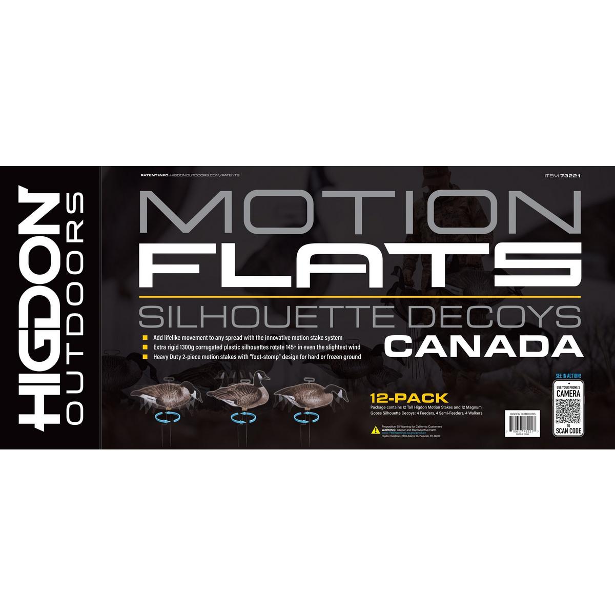 The easy and convenient way to add motion to your goose spread. Higdon Outdoors MOTION FLATS Silhouette decoys are sturdy, lightweight, easy to carry, easy to deploy, and lightning fast to pick up. They offer realistic high resolution printed detail with a finish that won't fade and is resistant to glare. Higdon's innovative motion stake system allows your silhouette decoys to rotate up to 145 degrees in even the slightest wind. 12-Pack. Box includes 12 Tall Motion Stake systems, and 12 Magnum Size Canada Goose Decoys: 4 Walkers, 4 Semi-Feeders and 4 Feeder decoys.