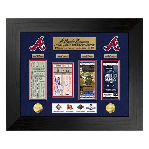 This commemorative Photo Mint celebrates 4-Time World Series Champions, the Atlanta Braves! This 24" x 20" wood frame with 2.5" wide molding features double matted under glass an Atlanta Braves commemorative World Series ticket collection for each of their World Series Titles. Matted below is a Gold Plated 39mm Braves 4-Time World Series Champions coin and a Gold Plated 39mm team coin, along with engraved nameplates and die cut team logos above the tickets. A limited edition of only 1000, each frame is accompanied by an individually numbered certificate of Authenticity. Officially licensed by the MLB and proudly made in the U.S.A by The Highland Mint!