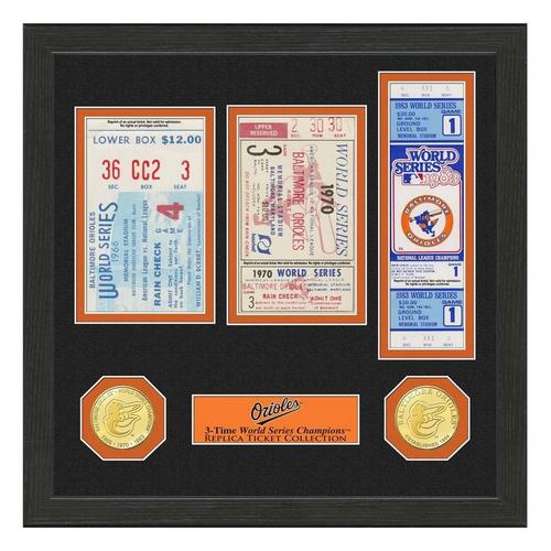 The Baltimore Orioles replica World Series ticket collection is featured in a 12” x 12” wood frame with double matting. A 39mm minted bronze Baltimore Orioles World Series Champions commemorative coin and a 39mm minted bronze Baltimore Orioles team coin are accompanied by a certificate of authenticity. It is officially licensed by the MLB and proudly made in the USA by The Highland Mint!