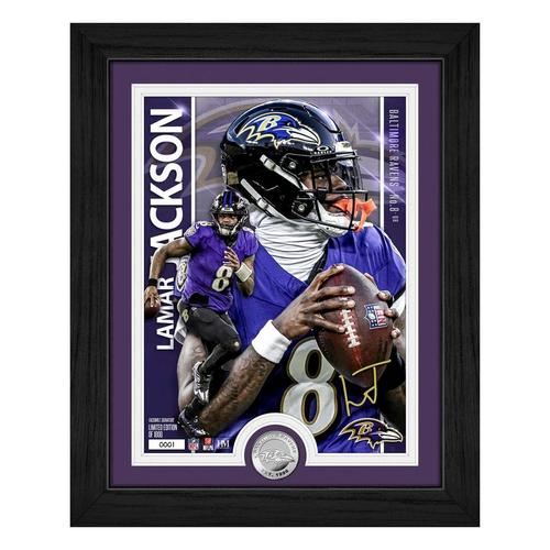 The Baltimore Ravens' Lamar Jackson is featured in this limited edition 13"x16" framed collectible that includes a stunning 8"x11" custom-designed artist print and a minted 39mm Baltimore Ravens silver-plated coin. Elegantly double-matted and protected under acrylic glass, this premium display piece is a must-have for NFL fans and collectors. Only 1,000 individually numbered pieces exist — each officially licensed by the NFL and NFLPA. Each frame includes a certificate of authenticity. Proudly made in the U.S.A. by The Highland Mint, this collectible arrives ready to hang and ready to impress.