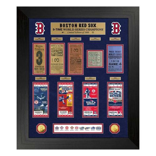 A limited edition of only 1000! Featured in a black 24" x 28" wood frame with 2.5" wide molding and double matting is the Boston Red Sox commemorative World Series ticket collection! This collectible frame is highlighted with a gold plate 39mm Red Sox 9-time World Series Champions commemorative coin and a gold plate 39mm team coin. Also matted in the frame are engraved nameplates and die cut team logos. Each frame has an individually numbered certificate of authenticity adhered to the back. Officially licensed by the MLB and proudly made in the U.S.A by The Highland Mint!
