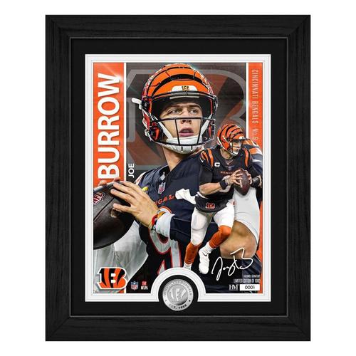 The Cincinnati Bengals' Joe Burrow is featured in this limited edition 13"x16" framed collectible that includes a stunning 8"x11" custom-designed artist print and a minted 39mm Cincinnati Bengals silver-plated coin. Elegantly double-matted and protected under acrylic glass, this premium display piece is a must-have for NFL fans and collectors. Only 1,000 individually numbered pieces exist — each officially licensed by the NFL and NFLPA. Each frame includes a certificate of authenticity. Proudly made in the U.S.A. by The Highland Mint, this collectible arrives ready to hang and ready to impress.