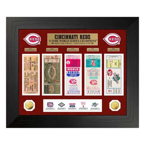 A limited edition of only 1000! Featured in a black 24" x 20" wood frame with 2.5" wide molding and double matting is the Cincinnati Reds commemorative World Series ticket collection! This collectible frame is highlighted with a gold plate 39mm Reds World Series Champions commemorative coin and a gold plate 39mm team coin. Also matted in the frame are engraved nameplates and die cut team logos. Each frame has an individually numbered certificate of authenticity adhered to the back. Officially licensed by the MLB and proudly made in the U.S.A by The Highland Mint!