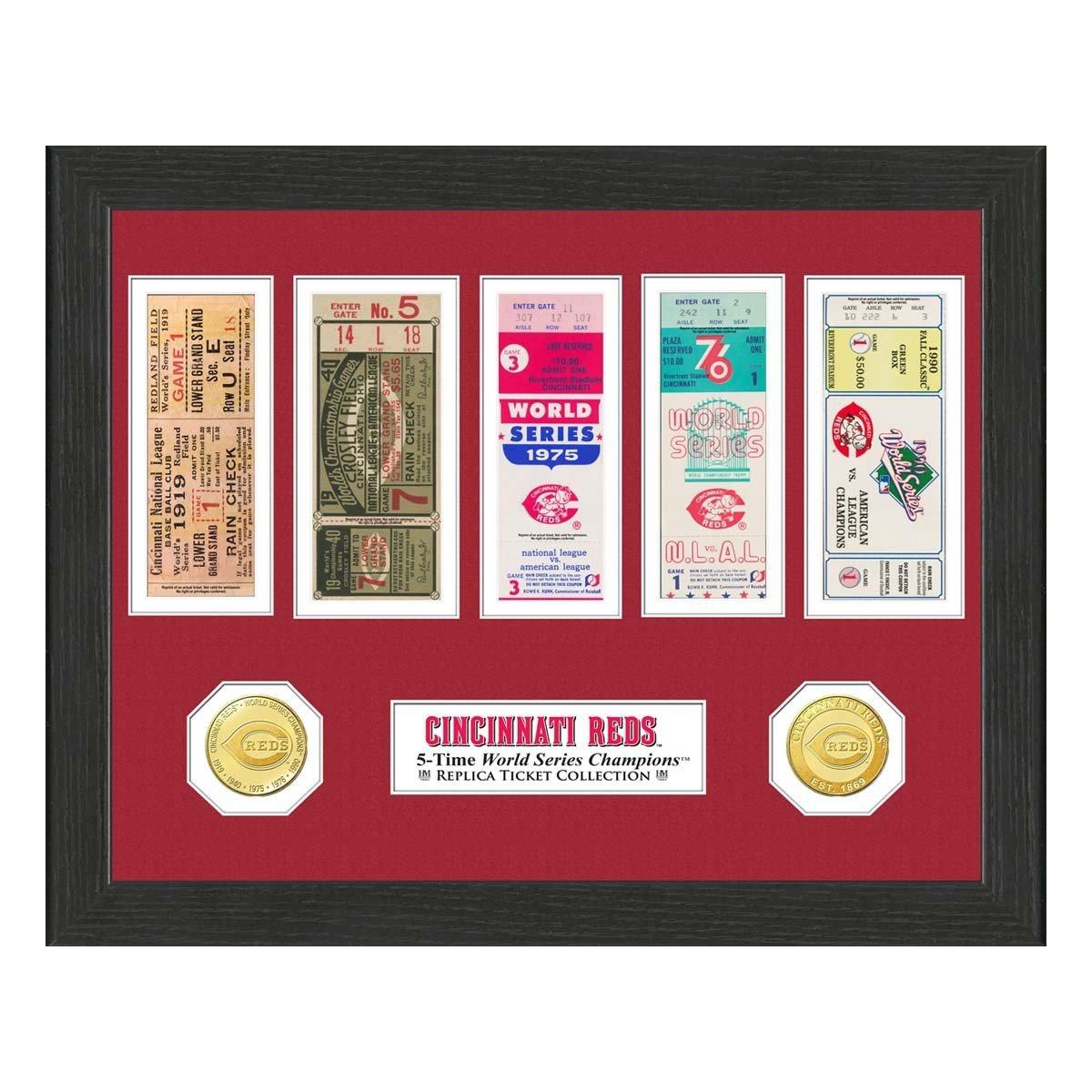 The Cincinnati Reds replica World Series ticket collection is featured in a 12” x 15” wood frame with double matting. A 39mm minted bronze Cincinnati Reds World Series Champions commemorative coin and a 39mm minted bronze Cincinnati Reds team coin are accompanied by a certificate of authenticity. It is officially licensed by the MLB and proudly made in the USA by The Highland Mint!