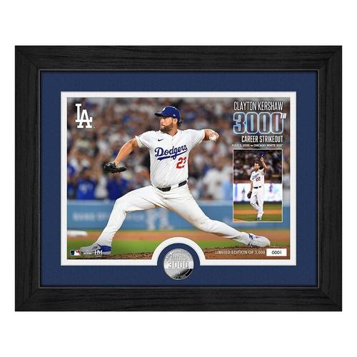 This limited edition 13" x 16" frame showcases a hand-numbered 8" x 11" print of Clayton Kershaw making his 3,000th career strikeout at Dodger Stadium on July 2, 2025. Double matted under protective acrylic glass, it includes a silver-plated 39mm minted 3000 Strike Outs Coin. Limited to only 3,000 and officially licensed by MLB and the MLBPA, each collectible Photo Mint comes with a certificate. Proudly made in the U.S.A. by The Highland Mint!