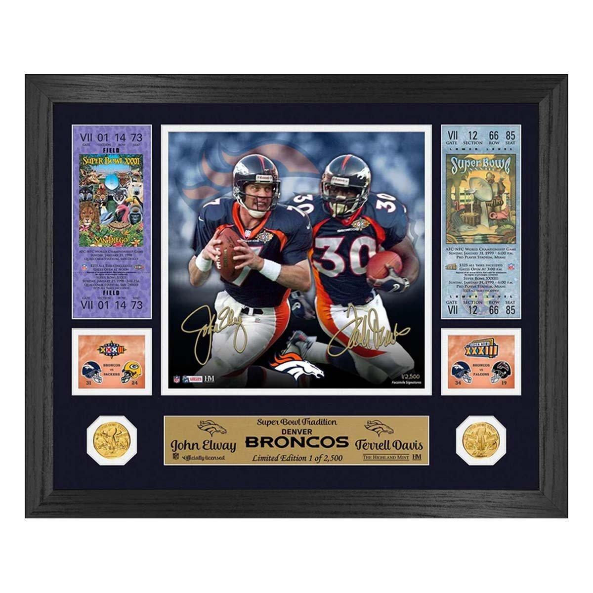 Add some team spirit to your home with the Highland Mint Denver Broncos John Elway & Terrell Davis Super Bowl Traditions Bronze Coin Photo Mint. With this Denver Broncos decor, you’ll leave no doubt who you root for. From the living room to the kitchen, this Denver Broncos decoration will help you cheer on your team to victory. Show off your favorite NFL team to all your visitors and personalize your house, apartment, or fan cave with the Highland Mint Denver Broncos John Elway & Terrell Davis Super Bowl Traditions Bronze Coin Photo Mint.