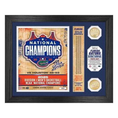 This limited edition 13"x16" frame features in double matting under acrylic glass an 8”x11” hand-numbered print commemorating the 2025 NCAA Men's Basketball National Champions. Each print is combined with a banner listing the tournament scores on the road to the Championship as well as the 39mm minted 2025 NCAA Men's Basketball National Champions bronze coin and the institution bronze coin. A limited edition of 5,000 and officially licensed, each frame has a certificate of authenticity matted in the frame between the minted coins. Officially licensed and proudly made in the USA by The Highland Mint!