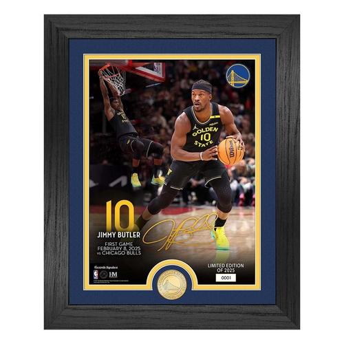 This limited edition 13" x 16" frame features in double matting under acrylic glass, an exclusive, hand-numbered 8"x11" print of Jimmy Butler with his facsimile (replica) signature on the print, combined with a 39mm minted Golden State Warriors bronze coin. This Photo Mint is a limited edition of only 2025 and officially licensed by the NBA and NBPA therefore each collectible frame is accompanied by a certificate of authenticity. Proudly made in the U.S.A. by The Highland Mint!