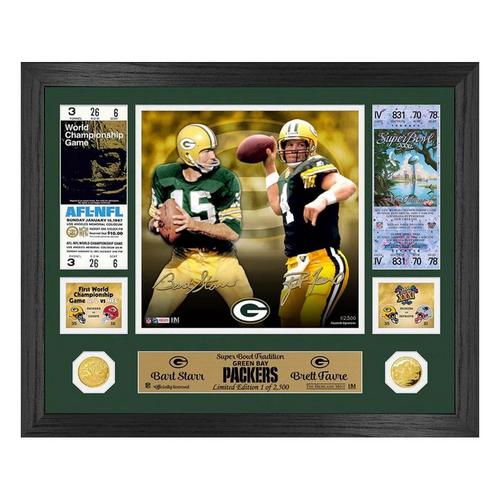Add some team spirit to your home with the Highland Mint Green Bay Packers Bart Starr & Brett Favre Super Bowl Traditions Bronze Coin Photo Mint. With this Green Bay Packers decor, you’ll leave no doubt who you root for. From the living room to the kitchen, this Green Bay Packers decoration will help you cheer on your team to victory. Show off your favorite NFL team to all your visitors and personalize your house, apartment, or fan cave with the Highland Mint Green Bay Packers Bart Starr & Brett Favre Super Bowl Traditions Bronze Coin Photo Mint.