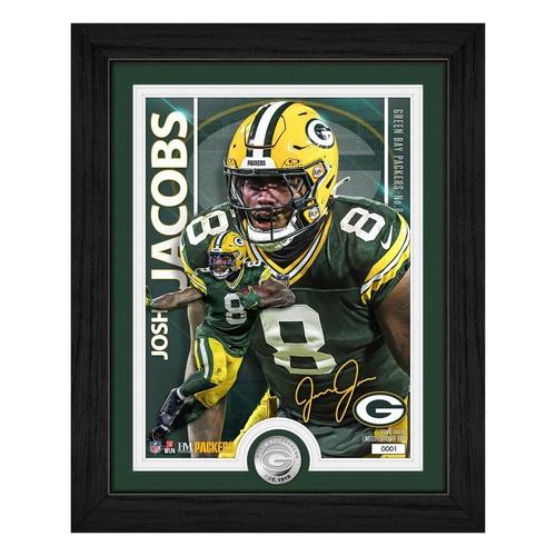The Green Bay Packers' Josh Jacobs is featured in this limited edition 13"x16" framed collectible that includes a stunning 8"x11" custom-designed artist print and a minted 39mm Green Bay Packers silver-plated coin. Elegantly double-matted and protected under acrylic glass, this premium display piece is a must-have for NFL fans and collectors. Only 1,000 individually numbered pieces exist — each officially licensed by the NFL and NFLPA. Each frame includes a certificate of authenticity. Proudly made in the U.S.A. by The Highland Mint, this collectible arrives ready to hang and ready to impress.