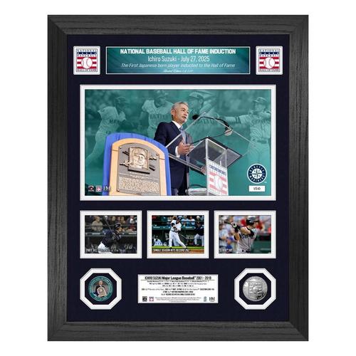 Celebrate Ichiro Suzuki’s 2025 Hall of Fame Induction with this limited-edition marquee frame! This premium 18" x 22" Marquee Photo Mint honors Ichiro Suzuki’s enshrinement into the National Baseball Hall of Fame with a stunning multi-image tribute. The centerpiece features a custom 8.5" x 11" print of Ichiro during his induction, accompanied by three action prints that highlight iconic moments from his legendary career. Beneath the images are two silver-plated 39mm minted coins: one 39mm silver-plated coin featuring the color image of Suzuki holding his Hall of Fame plaque and the other one is the Hall of Fame coin. A numbered certificate is matted between the coins, commemorating this as part of a strictly limited edition of only 510 pieces. Officially licensed by Major League Baseball and proudly made in the U.S.A. by The Highland Mint.