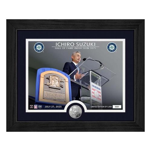 Celebrate Ichiro Suzuki’s legendary career and his Hall of Fame induction with this 13" x 16" limited-edition frame. Featured in elegant double matting under protective acrylic glass is a custom-designed, individually numbered 8" x 11" print of Ichiro Suzuki during his 2025 Hall of Fame induction and a 39mm silver-plated National Baseball Hall of Fame commemorative coin. A limited edition of only 5,000 and as the first Japanese-born player to be inducted into the National Baseball Hall of Fame, this Photo Mint is a highly regarded collectible. Officially licensed by Major League Baseball each piece is accompanied by a certificate. Proudly made in the U.S.A. by The Highland Mint.