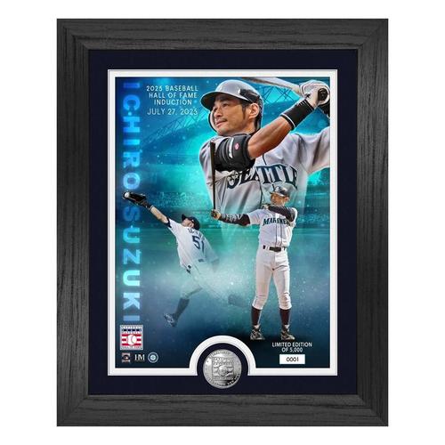 This limited edition 13" x 16" frame featuresin double matting under acrylic glass, an individually numbered 8" x 11" collage print commemorating the 2025 National Baseball Hall of Fame Induction of Ichiro Suzuki. As the first Japanes born player to receive this honor the print features Ichiro in multiple poses combined with a 39mm minted National Baseball Hall of Fame silver plated coin. A limited edition of only 5,000 and officially licensed by NBHOF and Ichiro, each Photo mint is accompanied by a certificate. Proudly made in the U.S.A. by The Highland Mint!