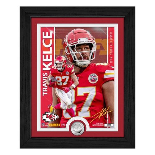 The Kansas City Chiefs' Travis Kelce is featured in this limited edition 13"x16" framed collectible that includes a stunning 8"x11" custom-designed artist print and a minted 39mm Kansas City Chiefs silver-plated coin. Elegantly double-matted and protected under acrylic glass, this premium display piece is a must-have for NFL fans and collectors. Only 1,000 individually numbered pieces exist — each officially licensed by the NFL and NFLPA. Each frame includes a certificate of authenticity. Proudly made in the U.S.A. by The Highland Mint, this collectible arrives ready to hang and ready to impress.