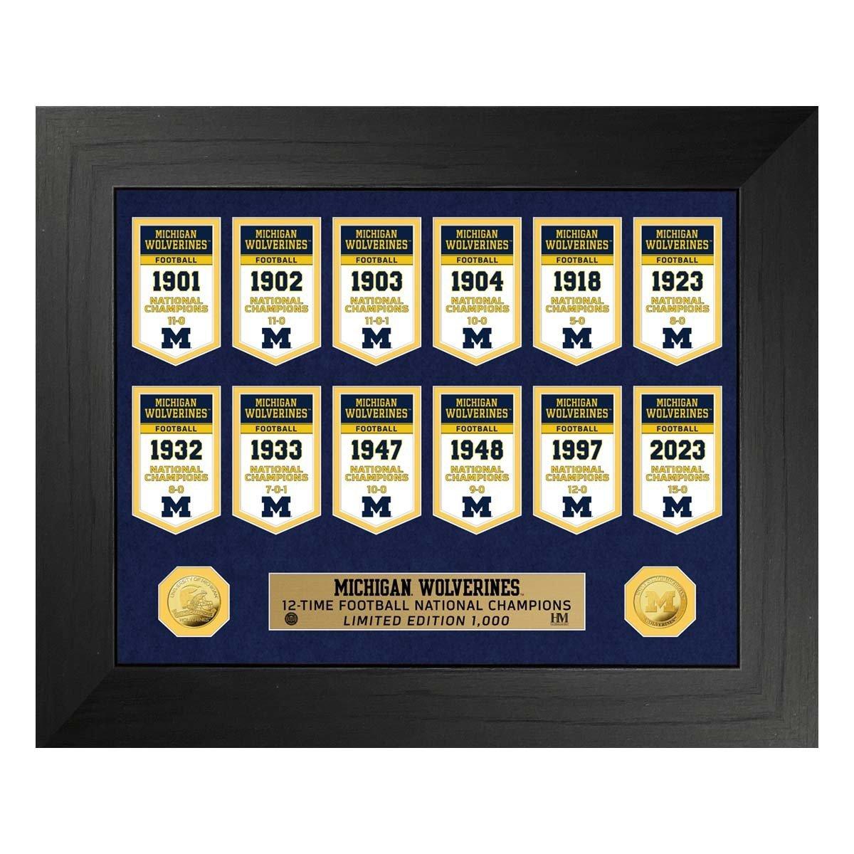Add some team spirit to your home with the Highland Mint Michigan Wolverines Championship Banner Collection Deluxe Gold Coin Photo Mint. With this Michigan Wolverines decor, you’ll leave no doubt who you root for. From the living room to the kitchen, this Michigan Wolverines decoration will help you cheer on your team to victory. Show off your favorite College team to all your visitors and personalize your house, apartment, or fan cave with the Highland Mint Michigan Wolverines Championship Banner Collection Deluxe Gold Coin Photo Mint.