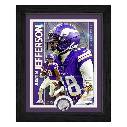 The Minnesota Vikings' Justin Jefferson is featured in this limited edition 13"x16" framed collectible that includes a stunning 8"x11" custom-designed artist print and a minted 39mm Minnesota Vikings silver-plated coin. Elegantly double-matted and protected under acrylic glass, this premium display piece is a must-have for NFL fans and collectors. Only 1,000 individually numbered pieces exist — each officially licensed by the NFL and NFLPA. Each frame includes a certificate of authenticity. Proudly made in the U.S.A. by The Highland Mint, this collectible arrives ready to hang and ready to impress.