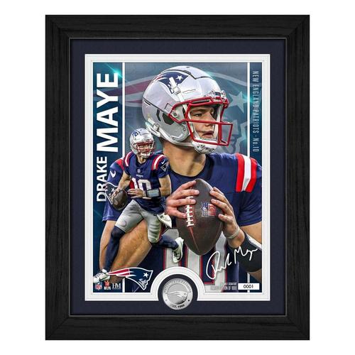 The New England Patriots' Drake Maye is featured in this limited edition 13"x16" framed collectible that includes a stunning 8"x11" custom-designed artist print and a minted 39mm New England Patriots silver-plated coin. Elegantly double-matted and protected under acrylic glass, this premium display piece is a must-have for NFL fans and collectors. Only 1,000 individually numbered pieces exist — each officially licensed by the NFL and NFLPA. Each frame includes a certificate of authenticity. Proudly made in the U.S.A. by The Highland Mint, this collectible arrives ready to hang and ready to impress.