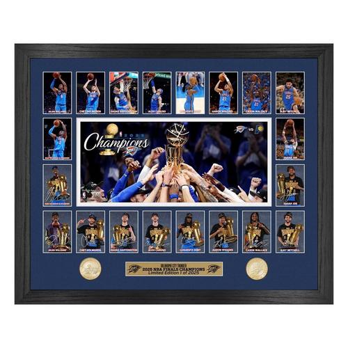 Honor the Oklahoma City Thunder's 2025 NBA Championship with this impressive 18" x 22" limited edition collectible frame. Showcased under acrylic glass with double matting, the centerpiece features a team image captured after their title-clinching victory, surrounded by individual player prints with replica (facsimile) signatures. Below the photos are two 39mm solid bronze minted coins — one celebrating the 2025 NBA Champions and the other featuring the Oklahoma City Thunder team logo. Limited to just 2,025 pieces, each frame comes with a Certificate of Authenticity. Officially licensed by the NBA and NBPA, and proudly made in the U.S.A. by The Highland Mint.
