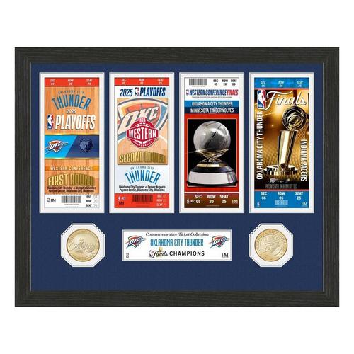 Celebrate the Oklahoma City Thunder's 2025 NBA Championship with this collectible frame featuring commemorative tickets from each round of their postseason journey. Each ticket — representing every playoff series including the NBA Finals — is paired with two 39mm solid bronze minted coins: one honoring the NBA Champions and the other showcasing the Oklahoma City Thunder logo. Officially licensed by the NBA, this framed piece comes with a Certificate of Authenticity and arrives ready to hang. Proudly made in the U.S.A. by The Highland Mint.