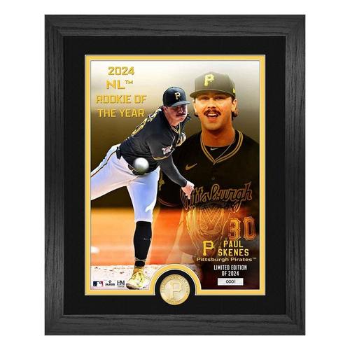 This limited edition of only 2,024 13" x 16" frame features in double matting under glass, an individually numbered 9" x 11" print commemorating the Pittsburgh Pirates Paul Skenes, the 2024 National League Rookie of the Year. Matted with the print is a 39mm minted Pirates Bronze Coin. A limited edition of only 2024, and officially licensed by MLB and MLBPA, each Photo Mint is delivered ready to hang. Proudly made in the U.S.A. by The Highland Mint!