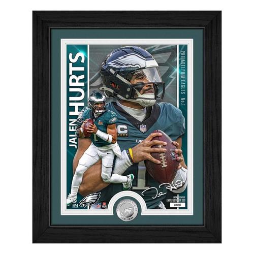 The Philadelphia Eagles' Jalen Hurts is featured in this limited edition 13"x16" framed collectible that includes a stunning 8"x11" custom-designed artist print and a minted 39mm Philadelphia Eagles silver-plated coin. Elegantly double-matted and protected under acrylic glass, this premium display piece is a must-have for NFL fans and collectors. Only 1,000 individually numbered pieces exist — each officially licensed by the NFL and NFLPA. Each frame includes a certificate. Proudly made in the U.S.A. by The Highland Mint, this collectible arrives ready to hang and ready to impress.
