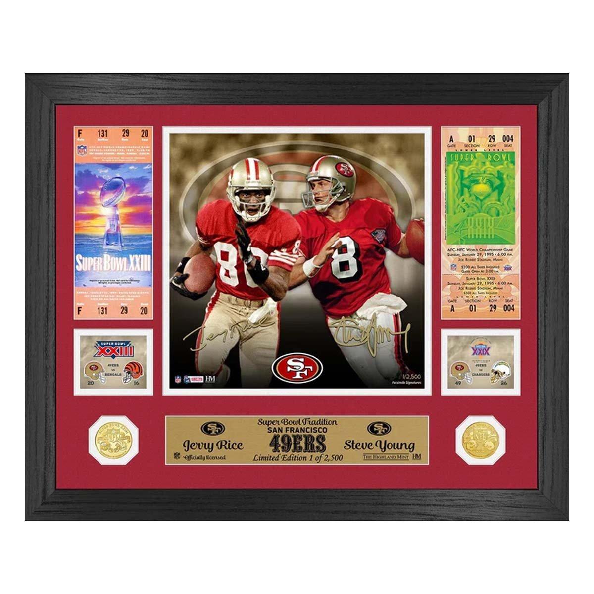 Add some team spirit to your home with the Highland Mint San Francisco 49ers Jerry Rice & Steve Young Super Bowl Traditions Gold Coin Photo Mint. With this San Francisco 49ers decor, you’ll leave no doubt who you root for. From the living room to the kitchen, this San Francisco 49ers decoration will help you cheer on your team to victory. Show off your favorite NFL team to all your visitors and personalize your house, apartment, or fan cave with the Highland Mint San Francisco 49ers Jerry Rice & Steve Young Super Bowl Traditions Gold Coin Photo Mint.
