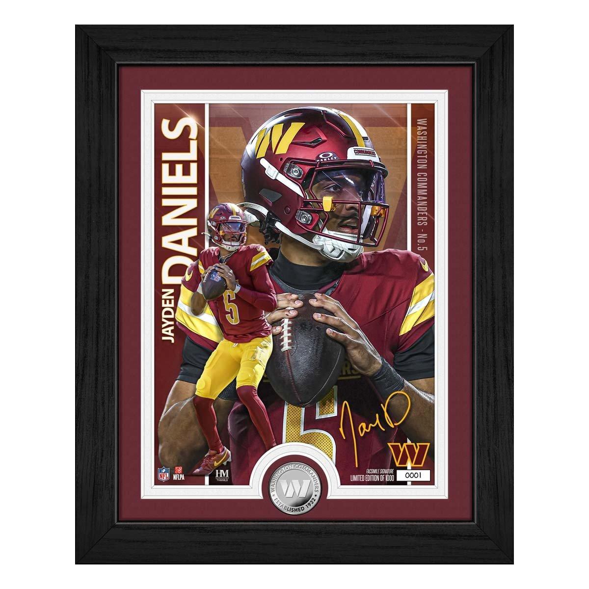 The Washington Commanders' Jayden Daniels is featured in this limited edition 13"x16" framed collectible that includes a stunning 8"x11" custom-designed artist print and a minted 39mm Washington Commanders silver-plated coin. Elegantly double-matted and protected under acrylic glass, this premium display piece is a must-have for NFL fans and collectors. Only 1,000 individually numbered pieces exist — each officially licensed by the NFL and NFLPA. Each frame includes a certificate of authenticity. Proudly made in the U.S.A. by The Highland Mint, this collectible arrives ready to hang and ready to impress.