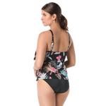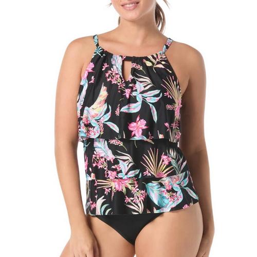 Layers of ruffles make this tankini top fashionable and flattering. A high neckline with adjustable straps gives you comfortable coverage. The chic, colorful floral print is inspired by bright summer florals.