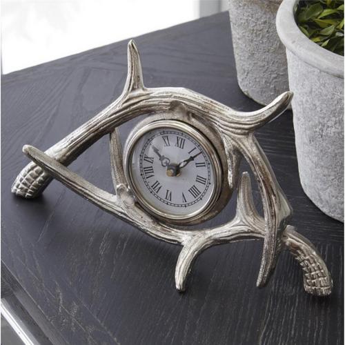 {"reviews":[],"offset":0,"limit":10,"total":0,"gtin":"840417330099"}"Full Description:\nElegant 11.75″ silver antler table clock with classic Roman numerals and timeless design. Perfect for mantels, shelves, or desks — blends rustic charm with refined style.\n\nFeatures:\n\u003cul>\n\u003cli>Major Materials: Aluminum\u003c/li>\n\u003cli>Prod Info 1: 1 AA Battery\u003c/li>\n\u003c/ul>\n\nSpecifications:\n\u003cul>\n\u003cli>6.5H x 11.75W x 4D\u003c/li>\n\u003c/ul>\n"