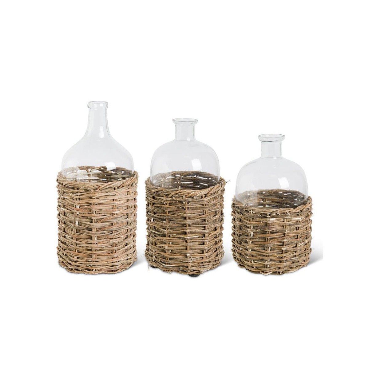 K&K Interiors Clear Glass Bottle in Woven Rattan Basket