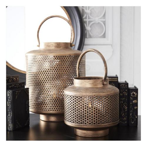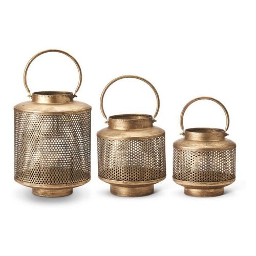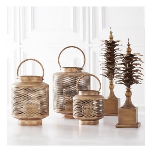 K&K Interiors Gold Metal Mesh Lanterns with Glass Hurricanes