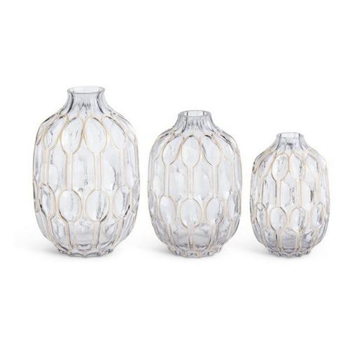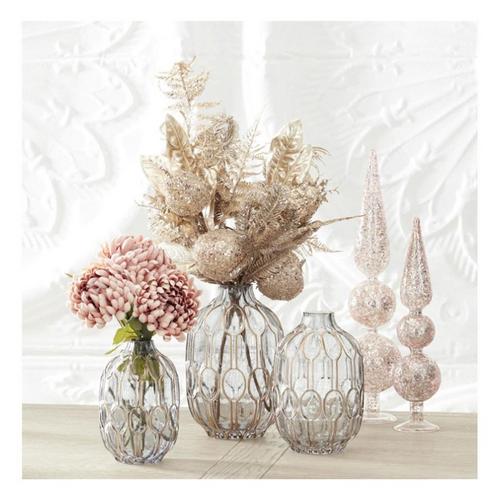 The K&K Interiors Smoked Glass Gold Oval Embossed Vase features a sleek, oval-shaped smoked glass body with an intricate embossed design and elegant gold accents, adding a sophisticated, modern touch to any floral arrangement or decor.